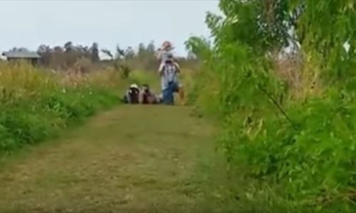 A monster crocodile appears from the edge of the bushes in front of the observers who are filming in the everglades.